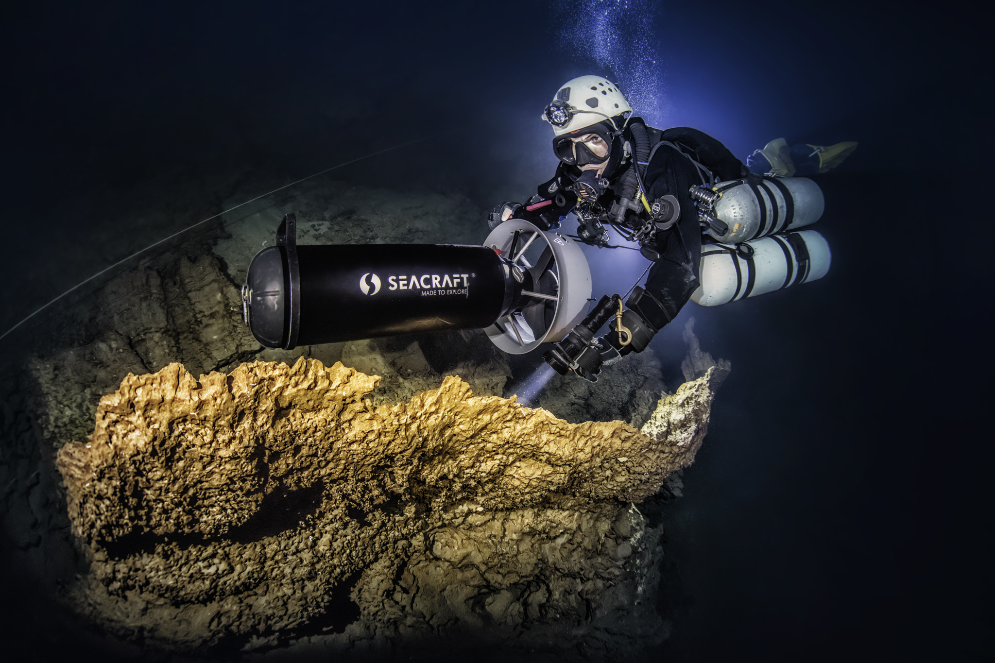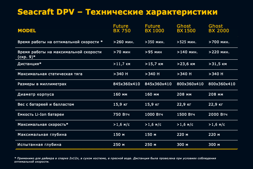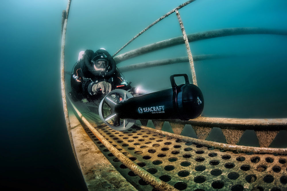 Инновационный дизайн подводных буксировщиков SEACRAFT обеспечивает высокий уровень безопасности и комфорта для всех дайверов. Запатентованный двигатель буксировщика более надежен, чем традиционные решения, и эффективно устраняет риск перегрева и затопления системы. Двигатель в сочетании с другими элементами привода обеспечивает высокую эффективность, большую рабочую дистанцию и продолжительное время погружения. Двухсторонняя рулевая ручка, установленная на буксировщики, обеспечивает эргономичное управление двумя руками и широкий диапазон плавного регулирования скорости. Бортовой компьютер с графическим дисплеем с несколькими заранее настроенными конфигурациями параметров и возможностью движения задним ходом, доступный на некоторых моделях, обеспечивает удобное и безопасное использование самыми требовательными дайверами, как рекреационными, так и техническими. Буксировщик также доступен в версиях для военных и спасательных операций.